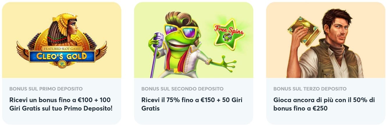 Per i giocatori attivi, sono disponibili bonus settimanali il lunedì e la domenica. Il primo di questi è un’offerta di ricarica del 50% che concede fino a 100 €, mentre il secondo premierà qualsiasi deposito superiore a 30 € con 100 giri gratis. L’importo minimo per il bonus del lunedì è di 50 €. Queste offerte prevedono gli stessi requisiti di scommessa di quelle di benvenuto, con l’eccezione che il limite di puntata viene innalzato a un più ragionevole 5 euro.