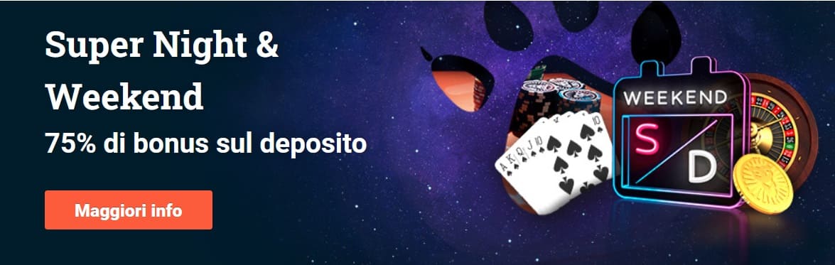- Bonus Casinò Live del 100%, fino a 550 € sempre disponibile e suddiviso sui primi depositi effettuati. Semplicemente effettuando un deposito di almeno 10€ e giocando l’importo 75x, potremo ricevere un bonus reale equivalente al 100% della somma versata, fino ad un massimo di 550€. Infatti, sul 1° deposito si possono ottenere il 100 % fino a 550 €, con un fondo tra i 10 € e i 550 €; con il 2° deposito si possono ottenere il 100% fino a 650 €, con un fondo tra i 10 € e i 650 €; con il terzo e ultimo deposito, invece, si può ottenere sempre il 100% fino a 800 €, con un fondo tra i 10 € e gli 800 €;